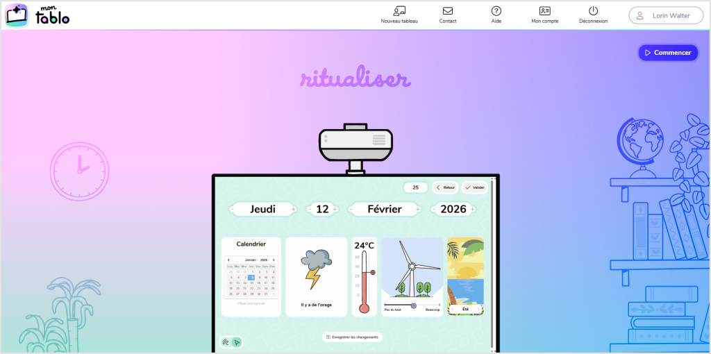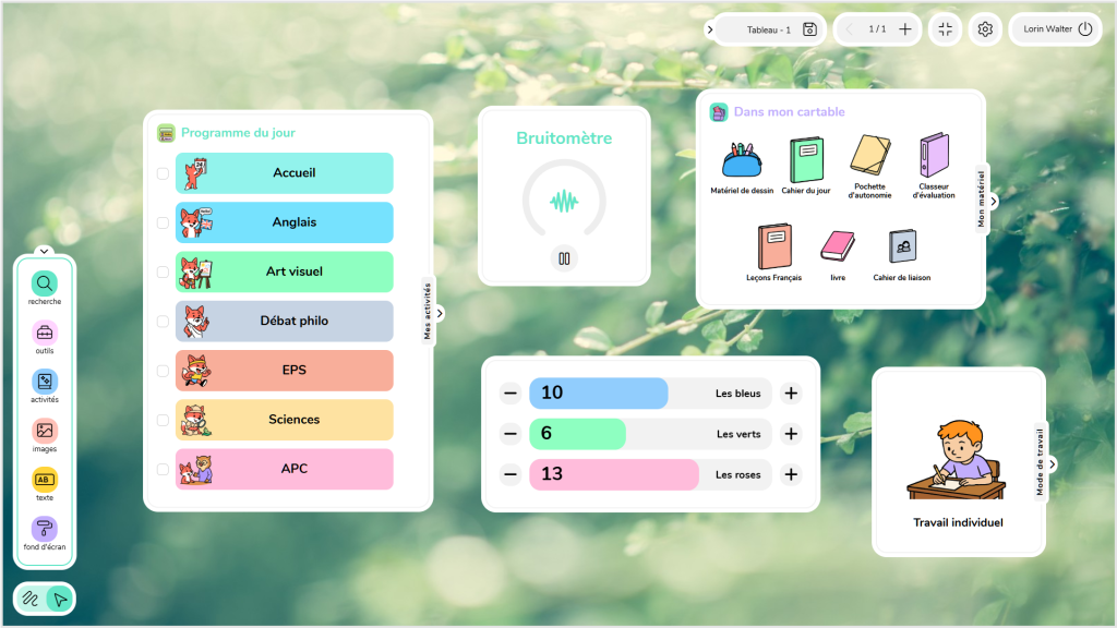 Nous avons construit cette plateforme autour d’une idée simple : proposer une seule interface pour afficher tout ce dont on a besoin au cours d’une journée d’école. Des outils pratiques (programme du jour, métiers de la classe, bruitomètre, cahier de textes…) aux activités pédagogiques (rituels, cartes géographiques, flashcards d’anglais…), tout est regroupé au même endroit.