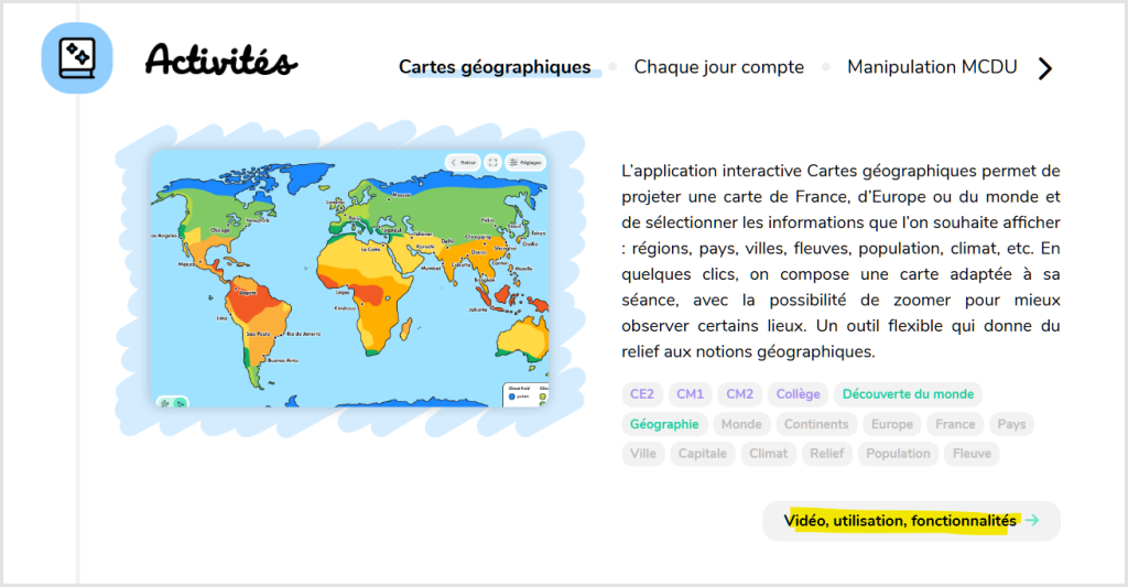 Vous pouvez consulter de façon plus exhaustive la liste de tous les outils de toutes les activités sur la page d’accueil de MonTablo.fr (en cliquant ensuite sur chacune d’entre elles, vous aurez des détails sur son utilisation en classe ainsi qu’une vidéo tuto pour le découvrir rapidement)
